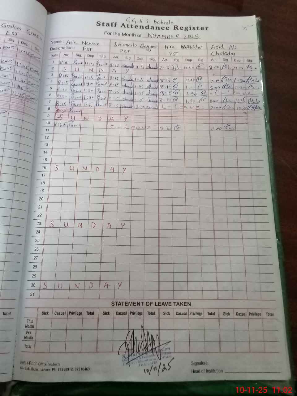 | CNIC | Full Name | Designation | R/C | Absence During Last Calender Month |