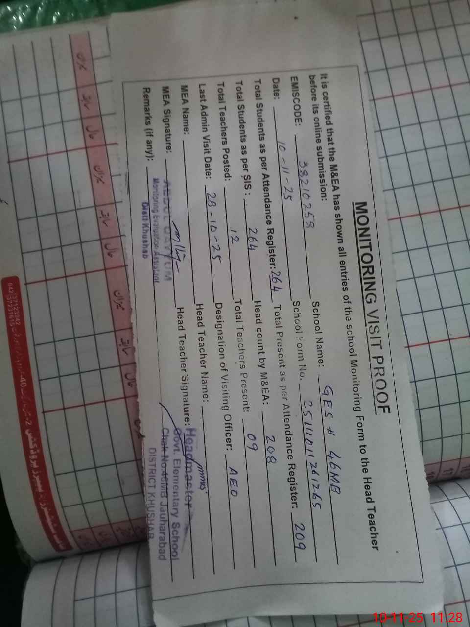 | Attendance Register | Head Teacher | MEA with School | Visit Proof |