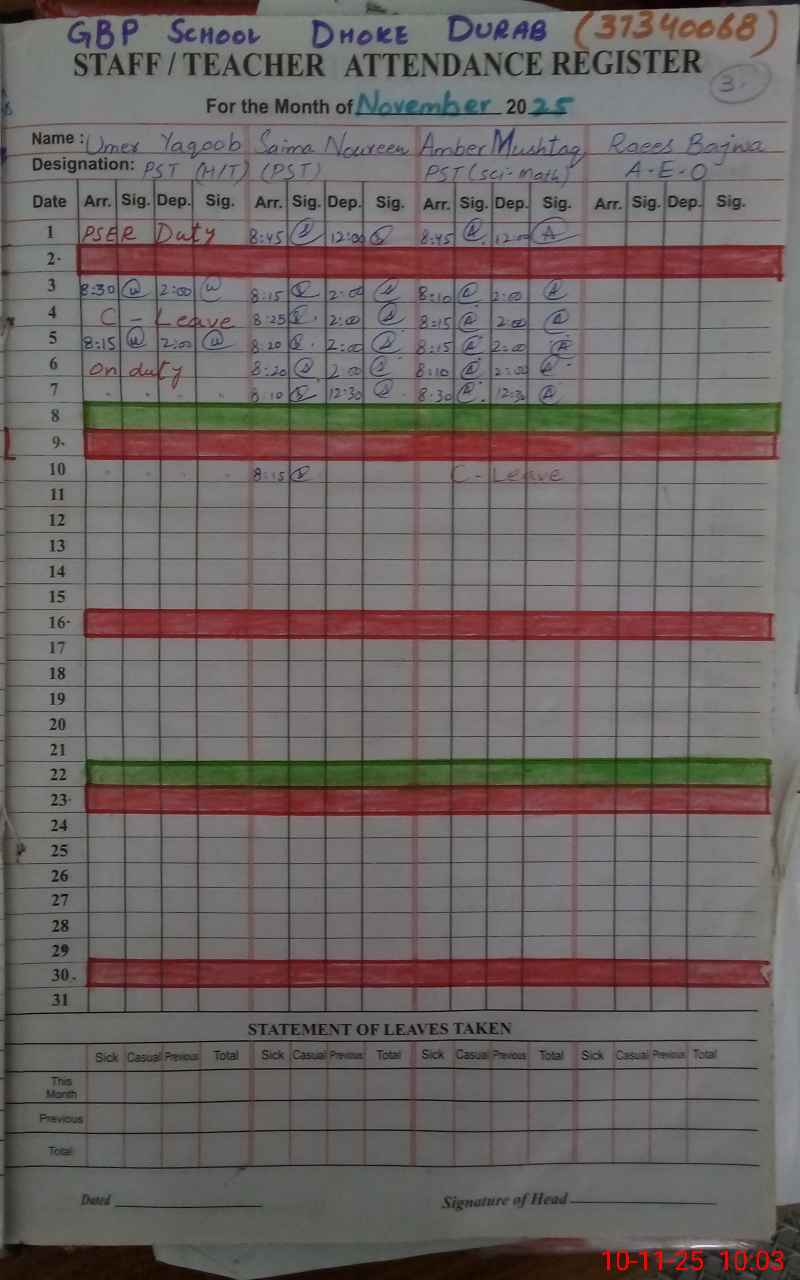 | Remarks (Use Separate Page if Required): Amber Mushtaq PST Were not present at school and markrd as casual leave on attendance register but her leave not even approved by head I marked her unauthorized | |||||