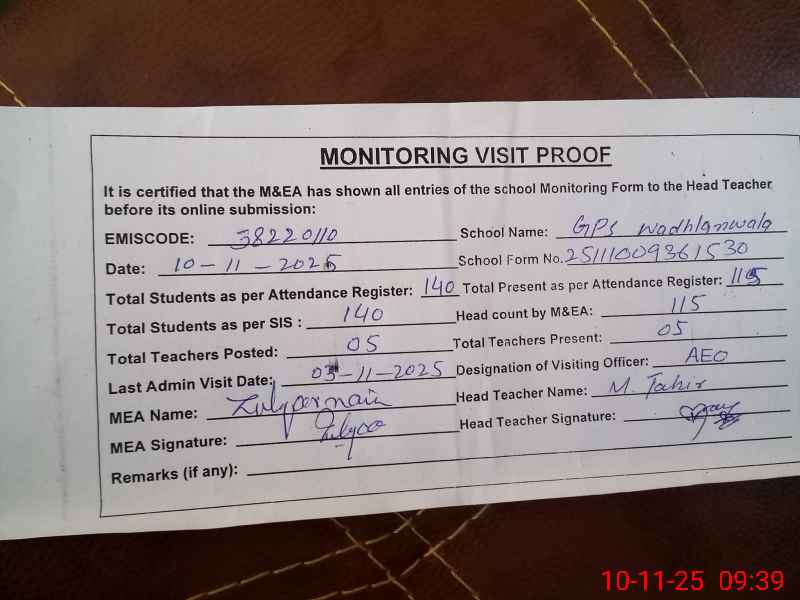 | EMIS Code: 38220110 | Name of School: GPS WADHLAN WALA | |||
