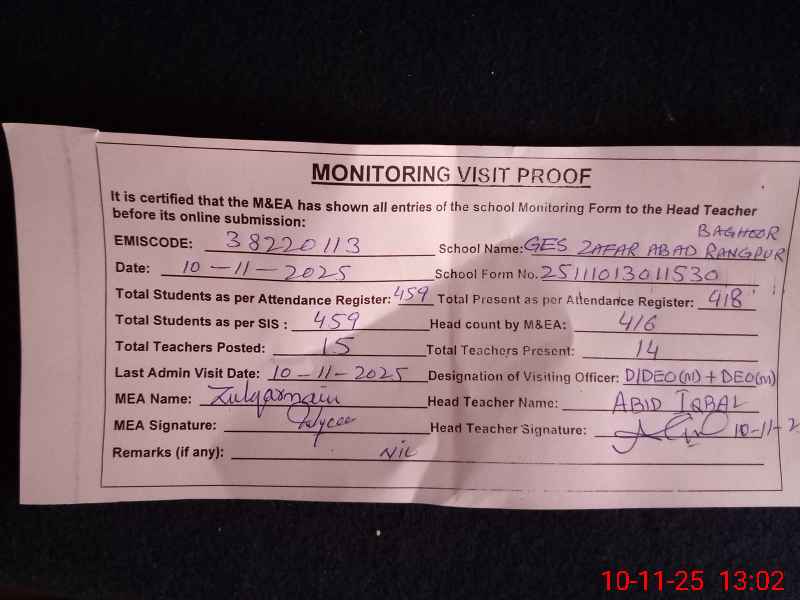 | EMIS Code: 38220113 | Name of School: GES ZAFAR ABAD RANG PUR BAGHOOR | |||