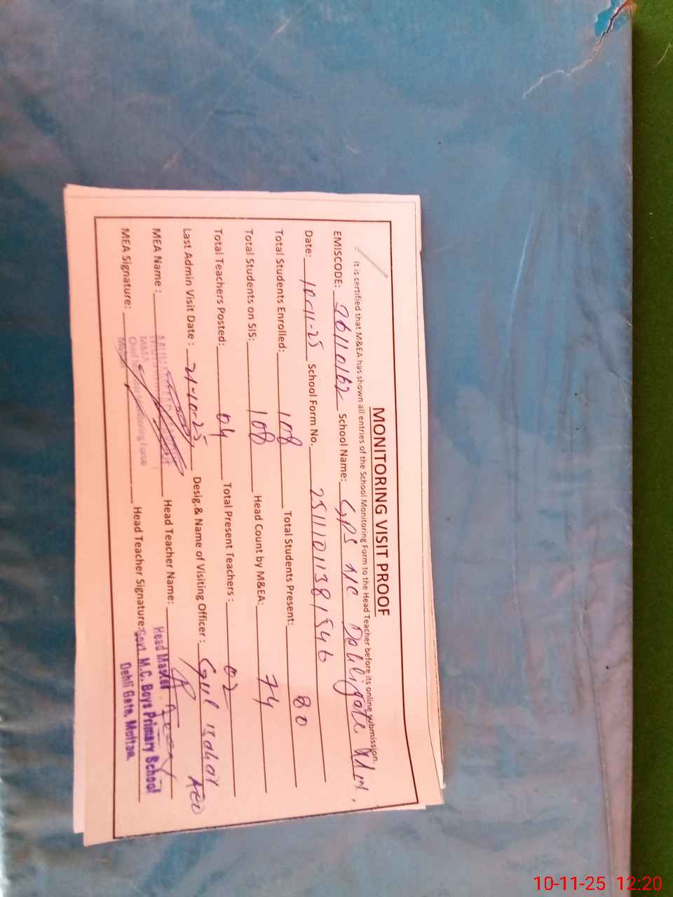 | EMIS Code: 36110162 | Name of School: GPS MC DEHLI GATE MULTAN | |||