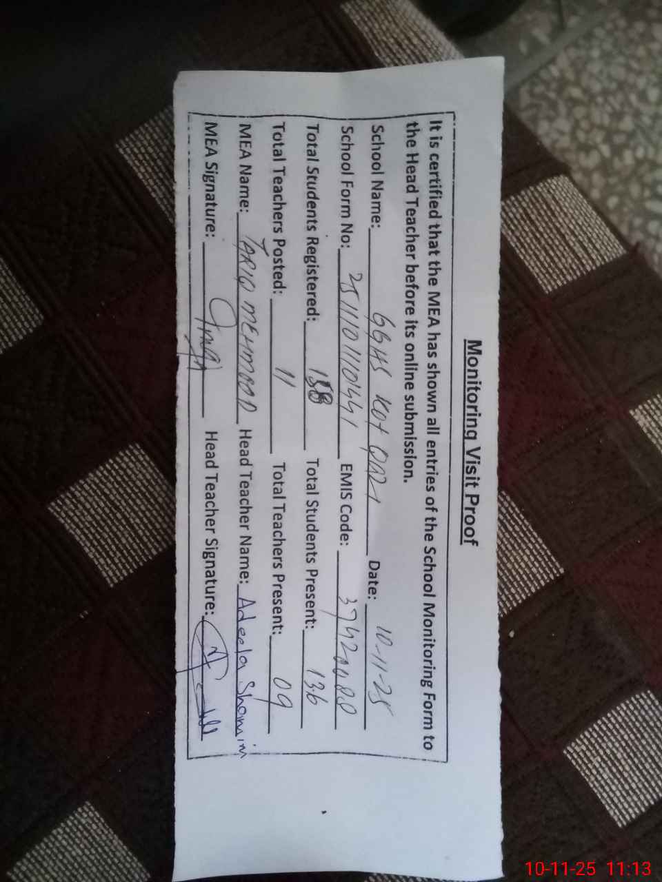 | Attendance Register | Head Teacher | MEA with School | Visit Proof |