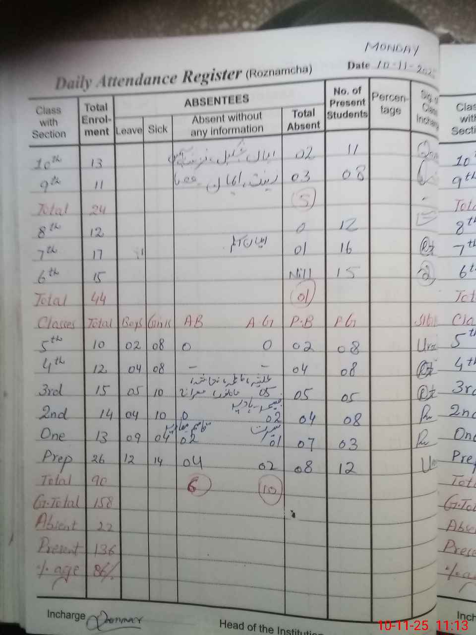 | Total Students Present | 0 | 0 | 20 | 10 | 12 | 10 | 12 | 10 | 15 | 16 | 12 | 8 | 11 | 136 | ||