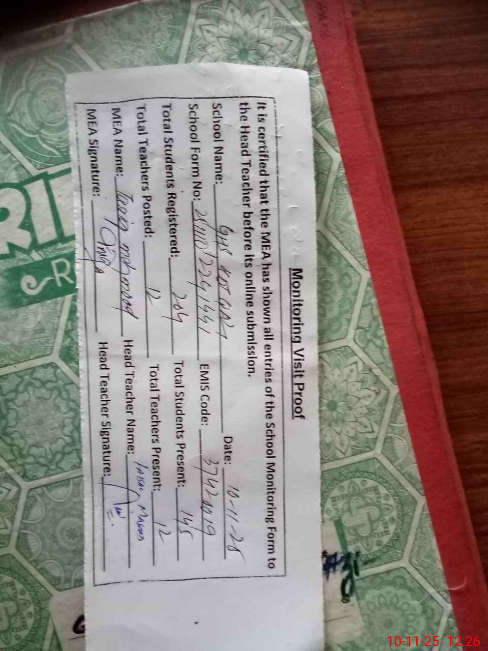 | Attendance Register | Head Teacher | MEA with School | Visit Proof |