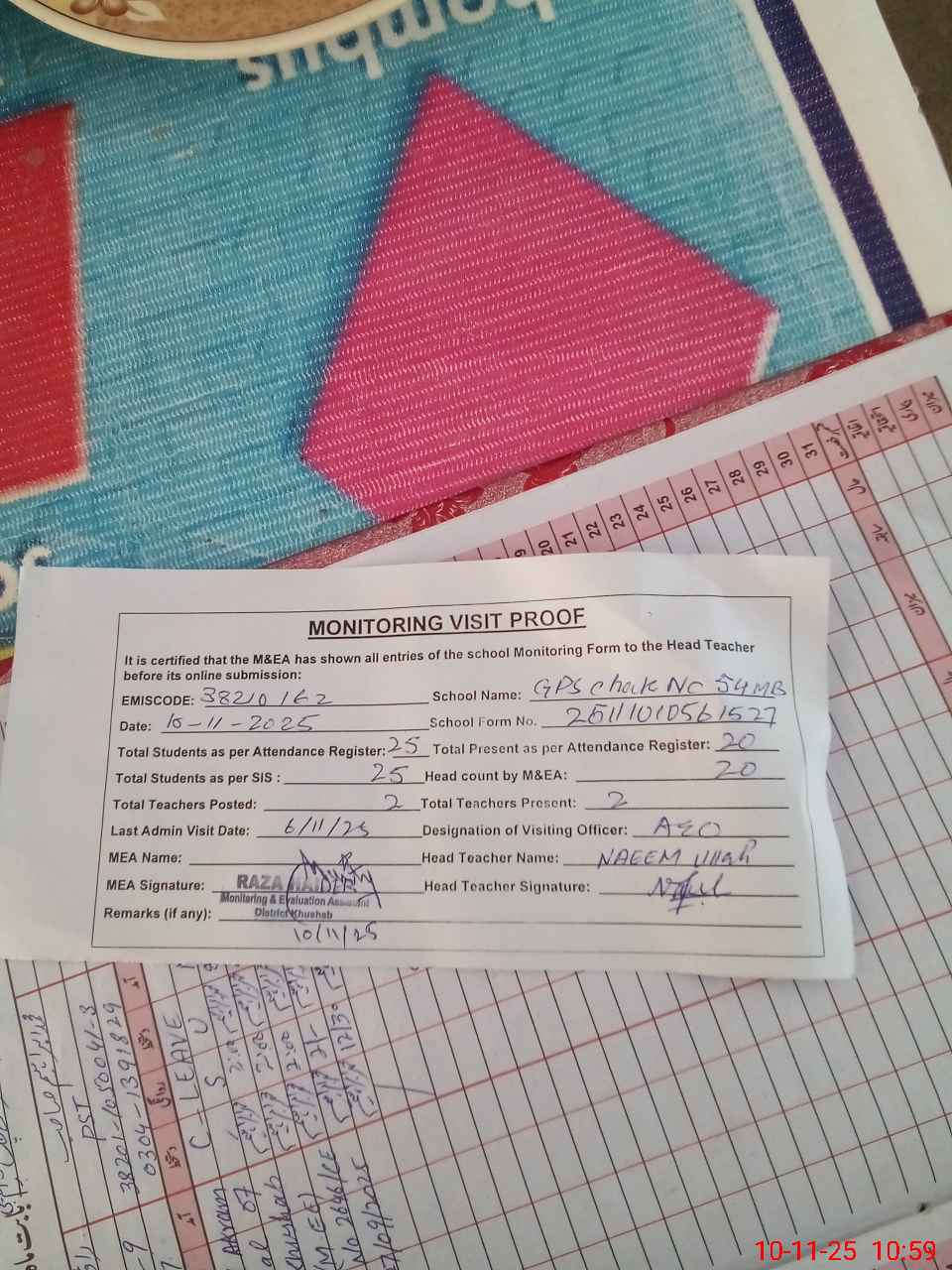 | Attendance Register | Head Teacher | MEA with School | Visit Proof |