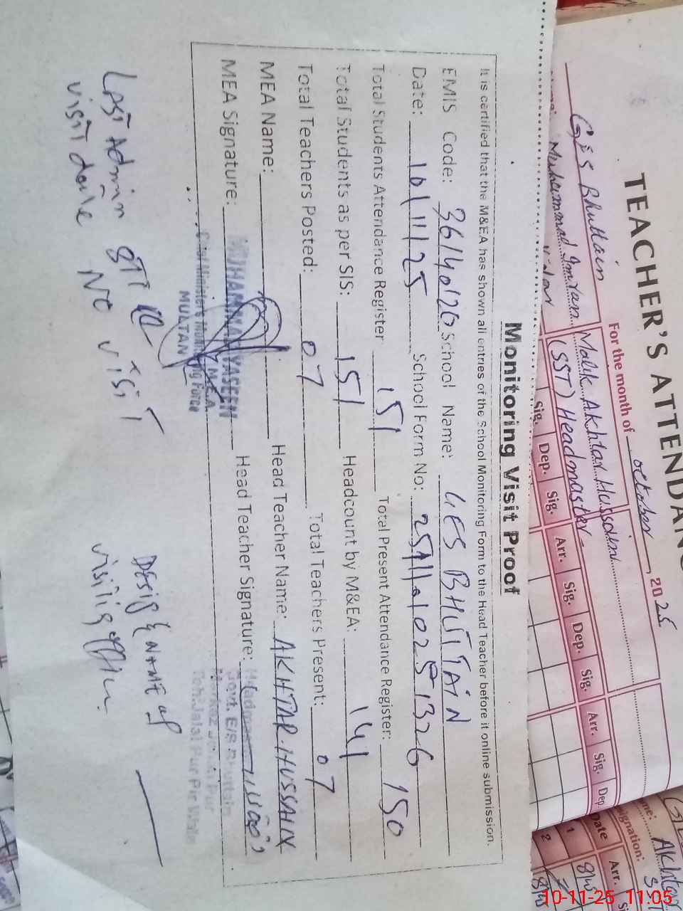 | Attendance Register | Head Teacher | MEA with School | Visit Proof |