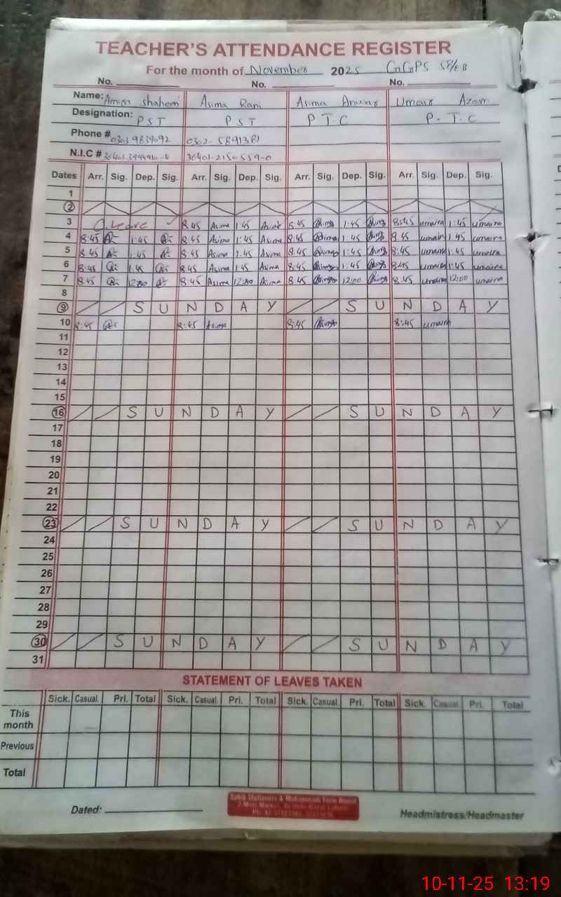 | Name: AM**** SH**** Designation: (School Headmaster's/Headmistress's) PST Phone/Cell Number: 03**** |