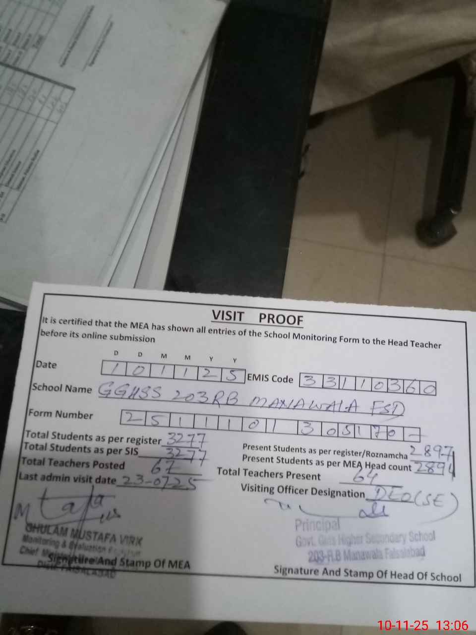 | Certified that this School was Inspected by the Undersigned MEA/DMO Today and the Information Stated Above is as Per Record. | |||||