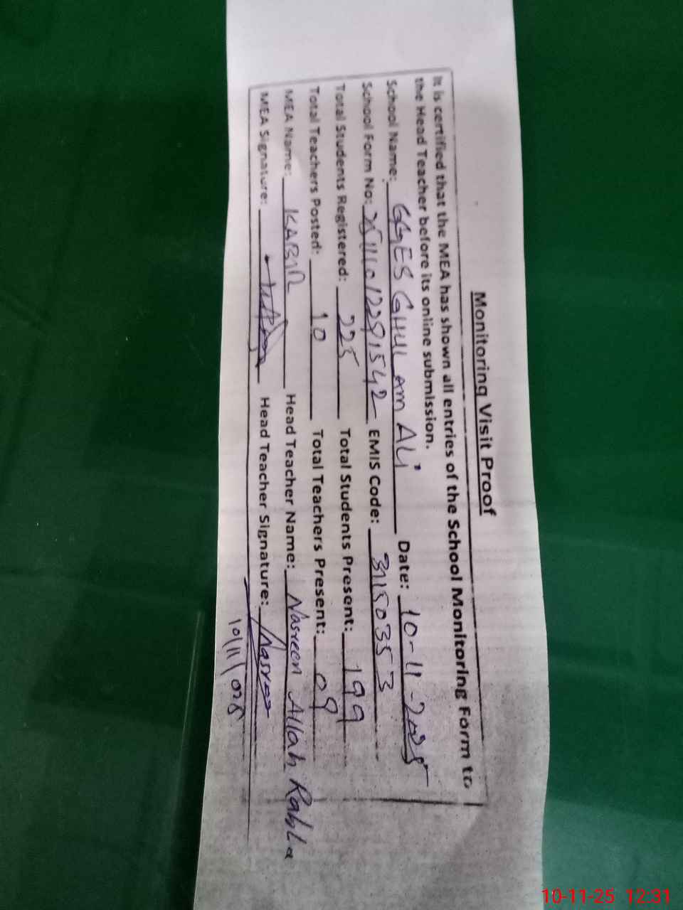 | Attendance Register | Head Teacher | MEA with School | Visit Proof |