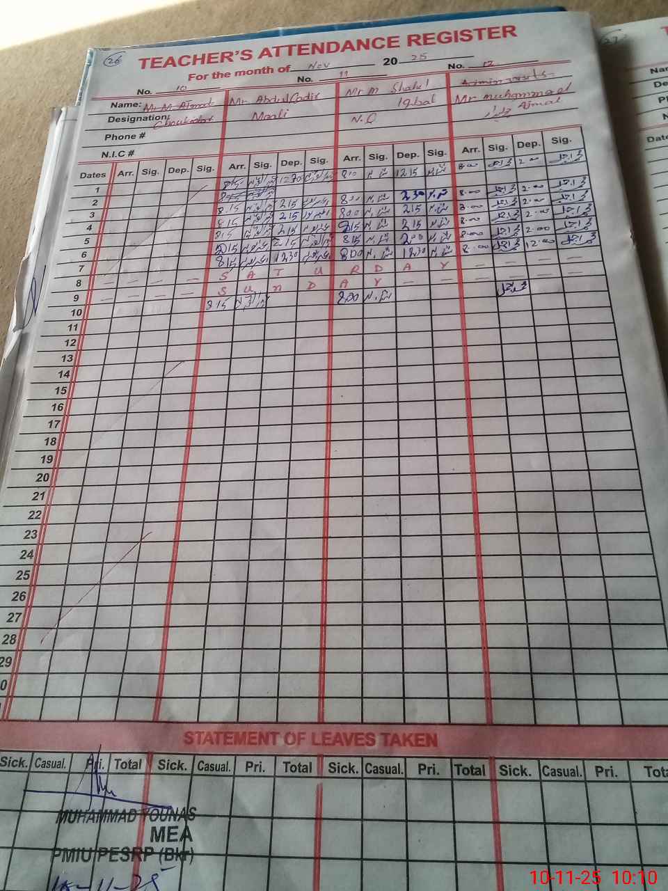 | CNIC | Full Name | Designation | R/C | Absence During Last Calender Month |