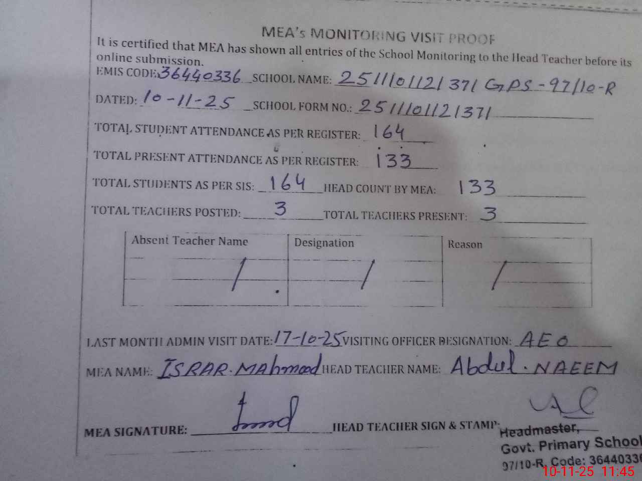 | Monitoring Date: 10-11-2025 | Start Time: 10-11-2025 11:01 AM | End Time: 10-11-2025 11:52 AM | Name of MEA: Is**** Me**** | |