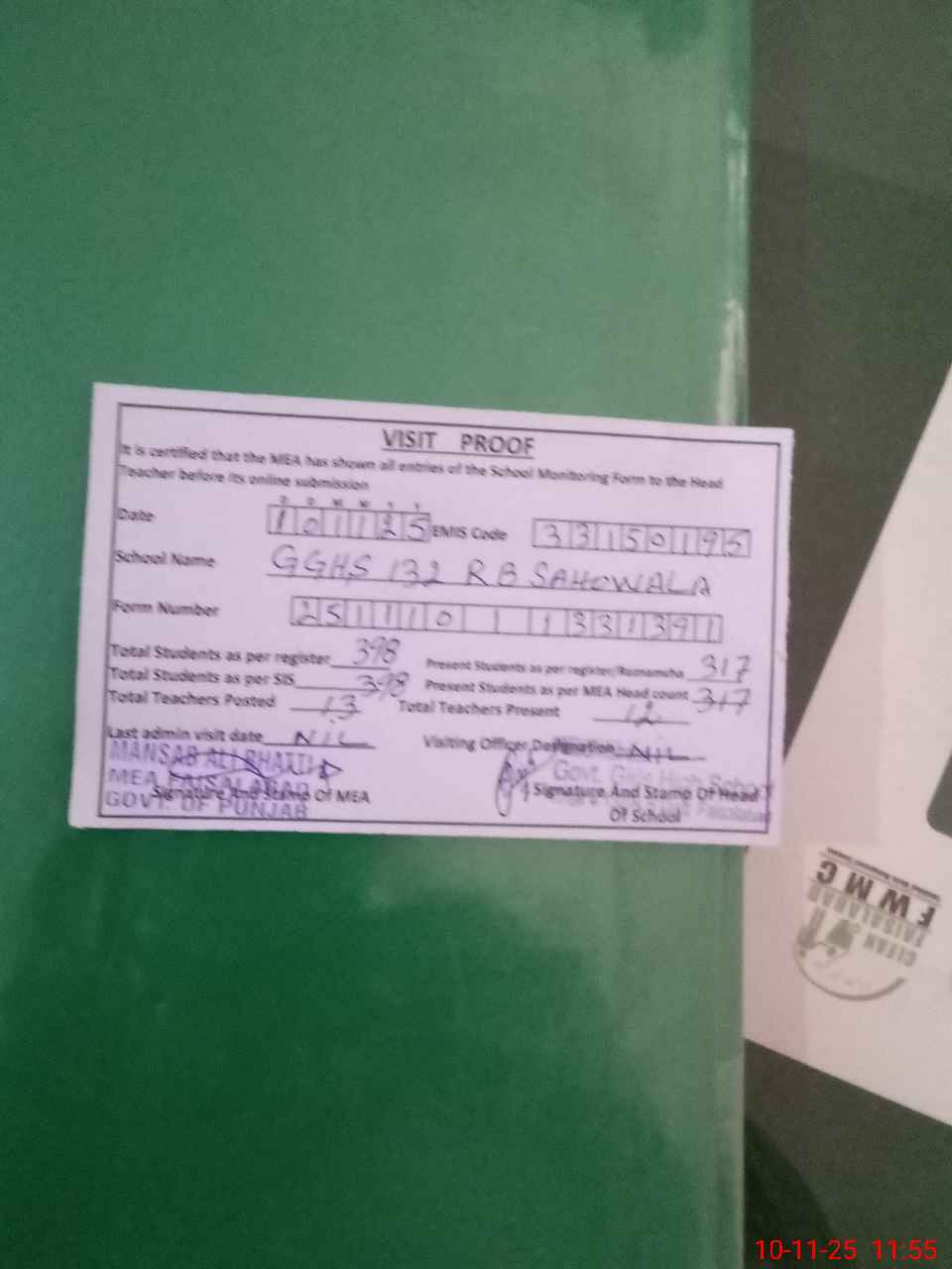 | EMIS Code: 33150195 | Name of School: GGHS CHAK 132 RB SAHO WALA | |||