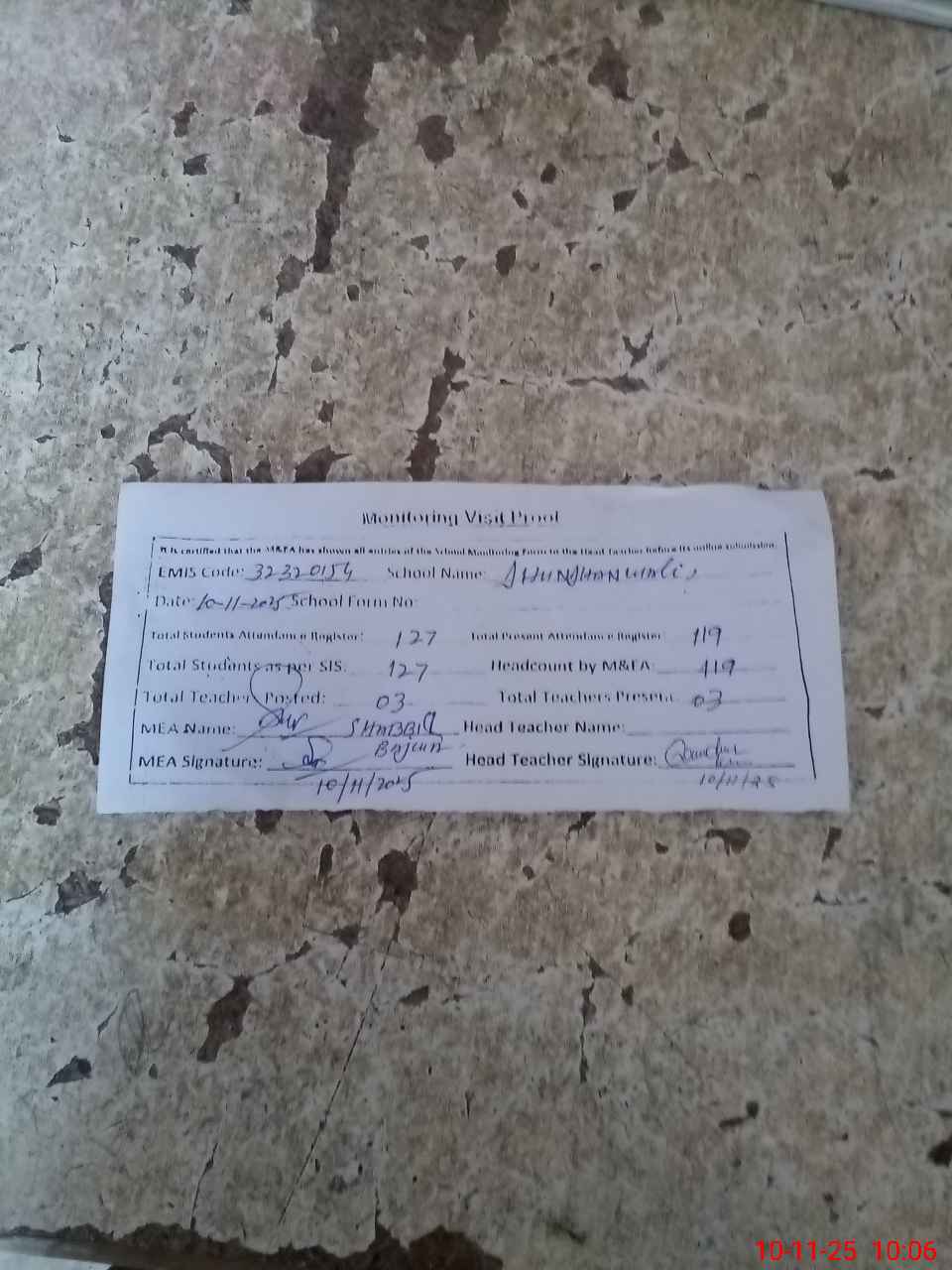 | Attendance Register | Head Teacher | MEA with School | Visit Proof |