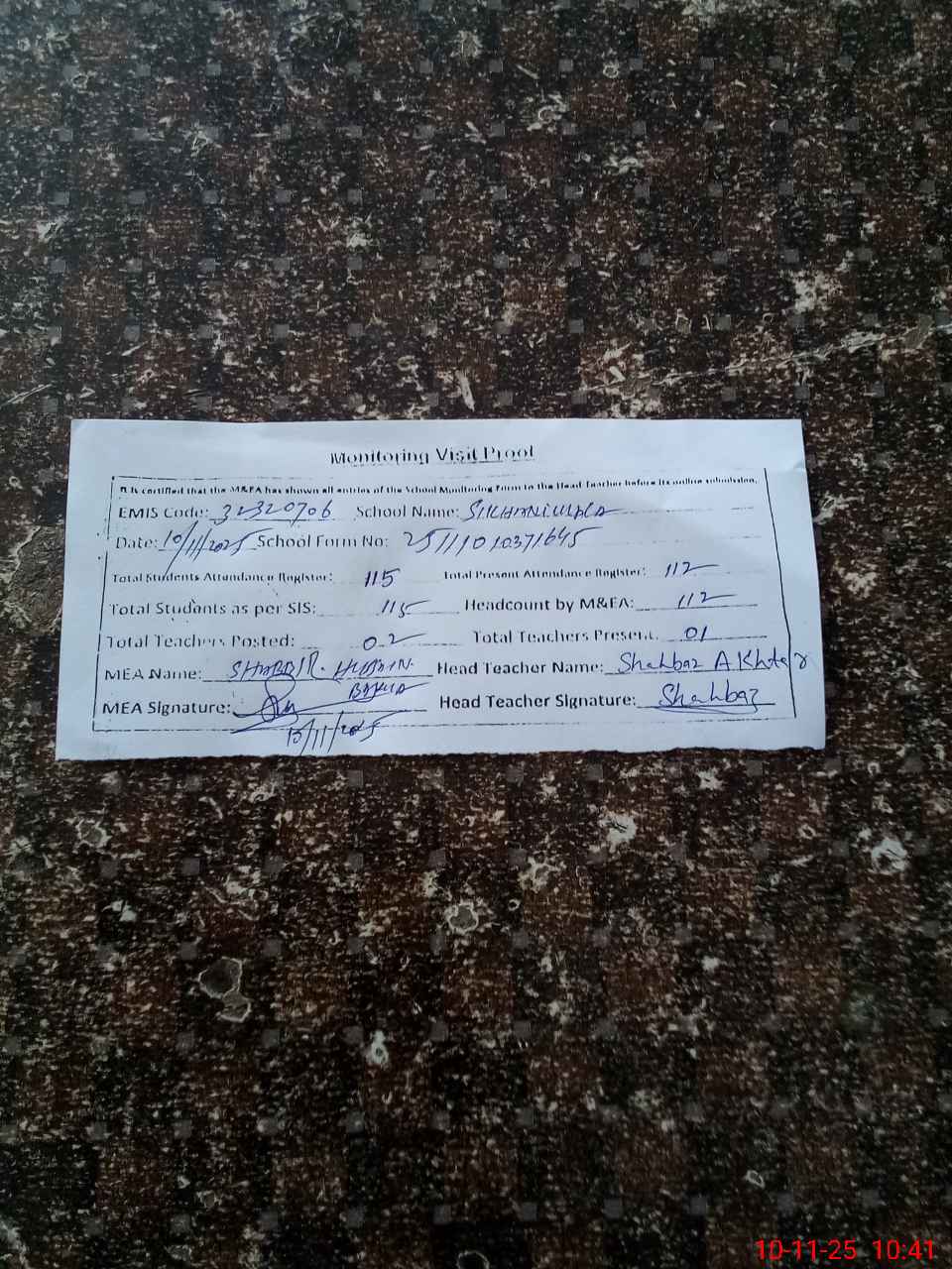 | Attendance Register | Head Teacher | MEA with School | Visit Proof |