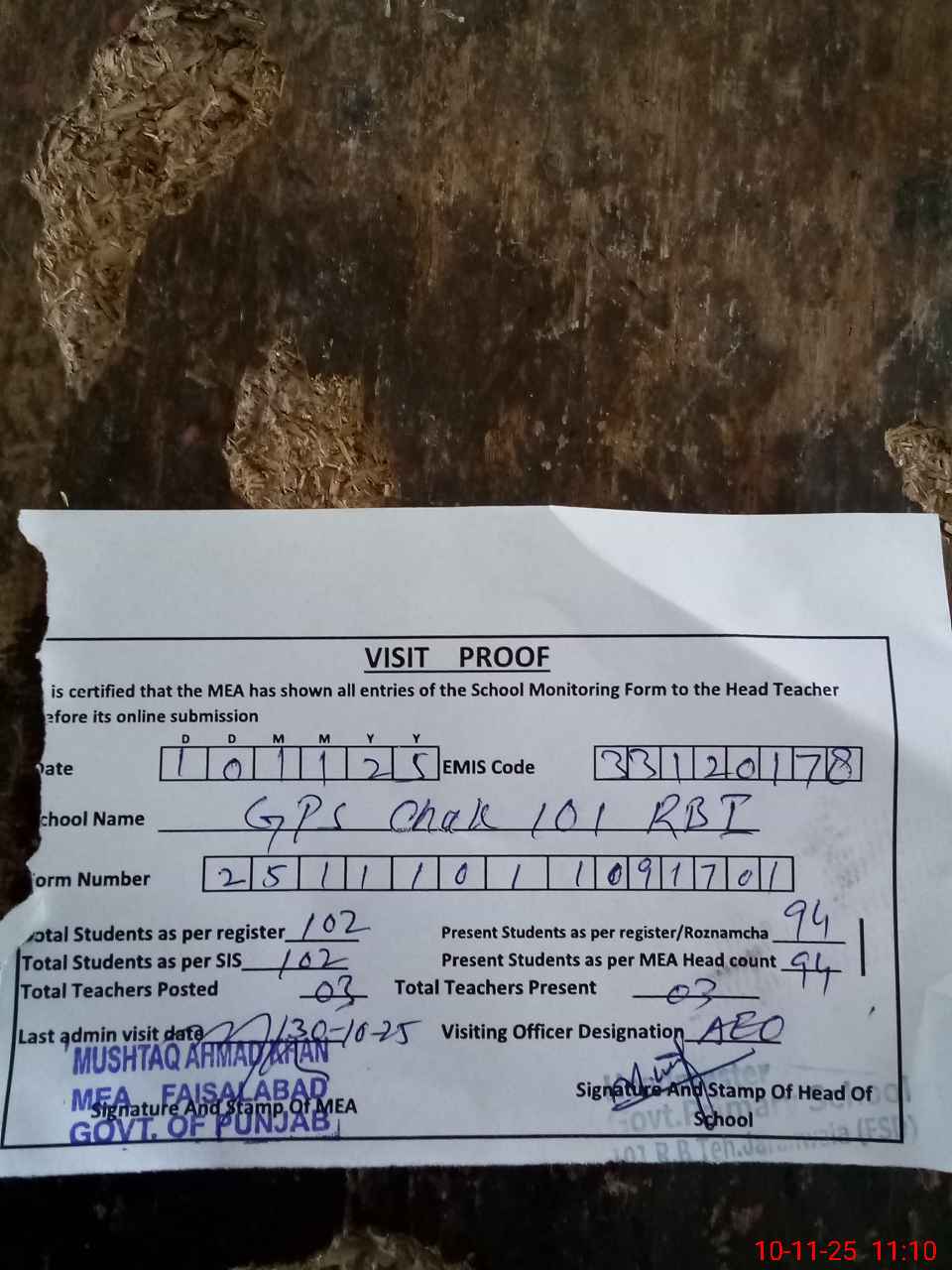 | EMIS Code: 33120178 | Name of School: GPS CHAK 101 RB I | |||