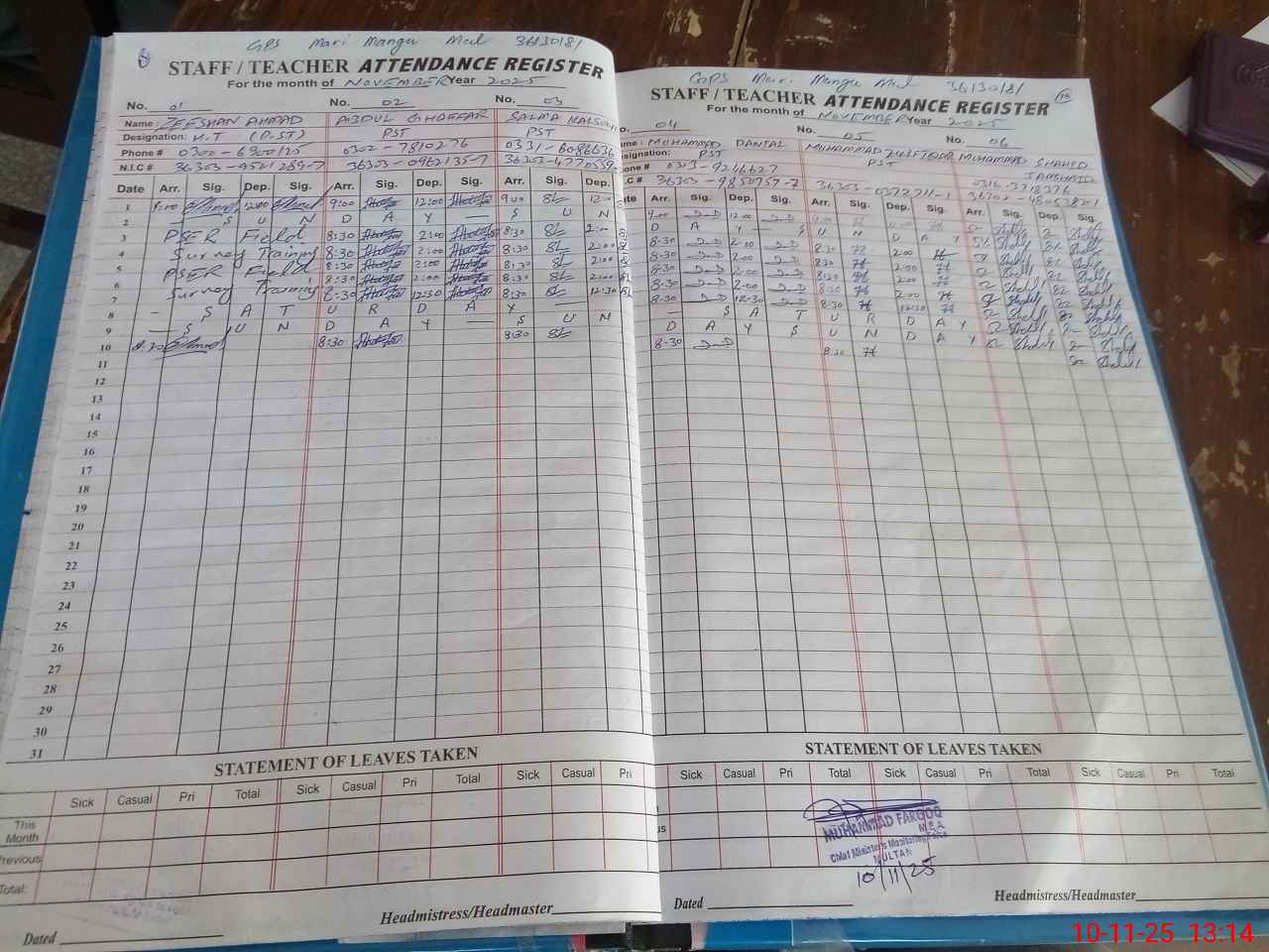 | CNIC | Full Name | Designation | R/C | Absence during last cal. month |
