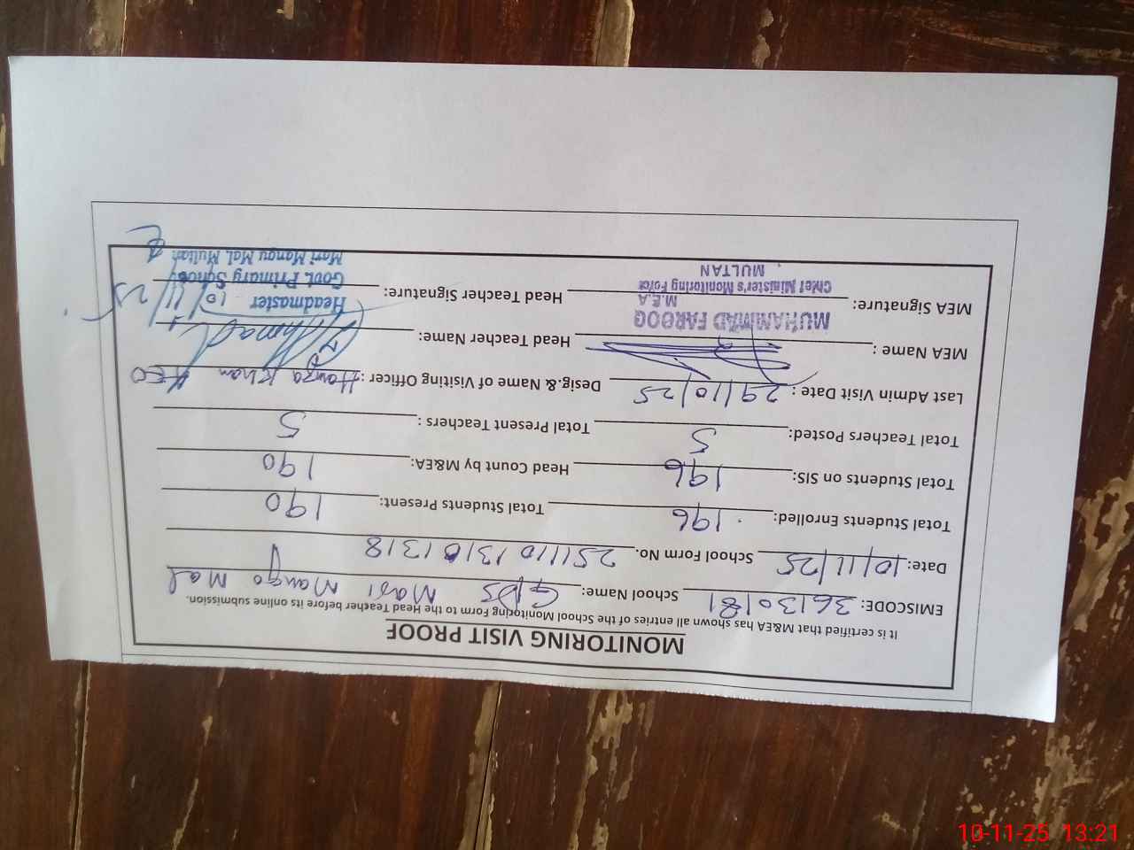 | Attendance Register | Head Teacher | MEA with School | Visit Proof |