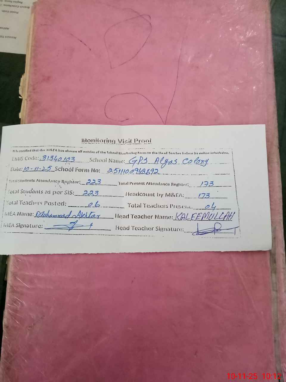 | Attendance Register | Head Teacher | MEA with School | Visit Proof |