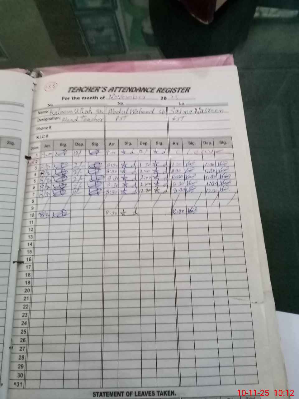 | CNIC | Full Name | Designation | R/C | Absence During Last Calender Month |