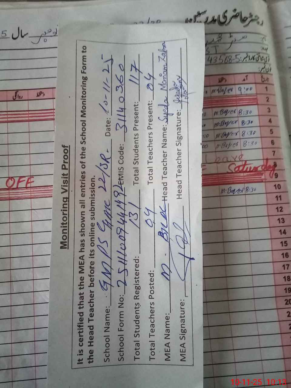 | Attendance Register | Head Teacher | MEA with School | Visit Proof |