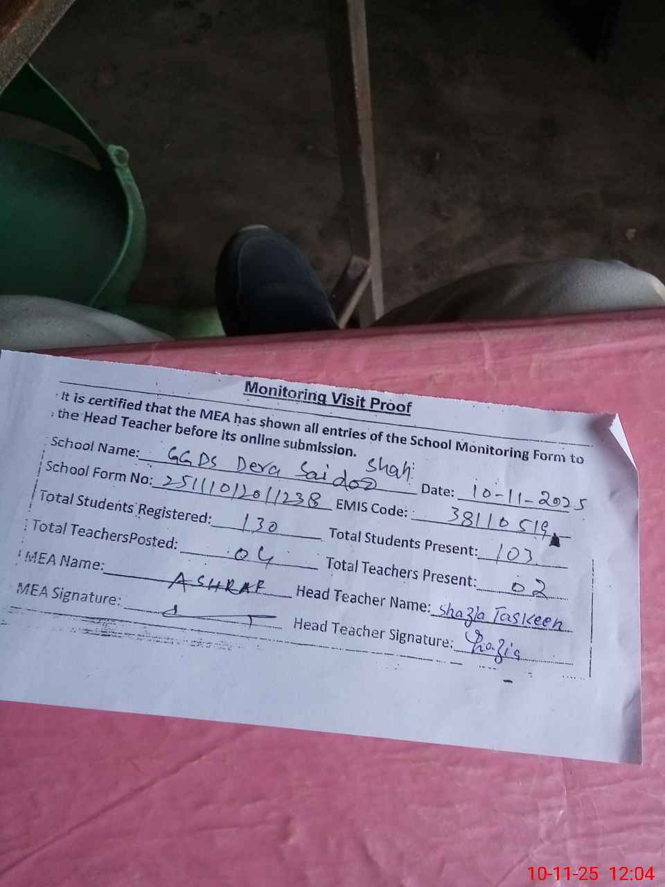 | Attendance Register | Head Teacher | MEA with School | Visit Proof |