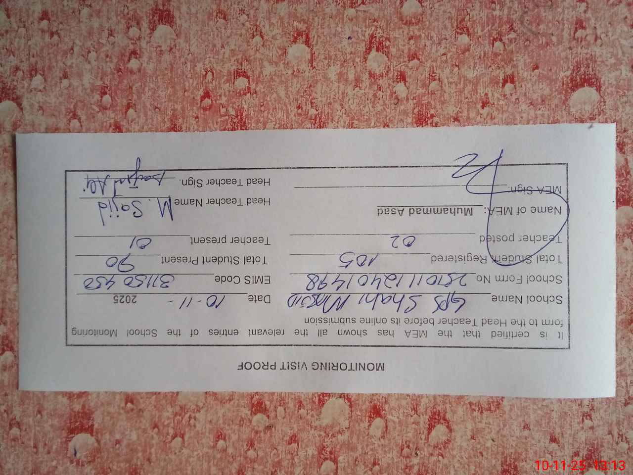 | Attendance Register | Head Teacher | MEA with School | Visit Proof |