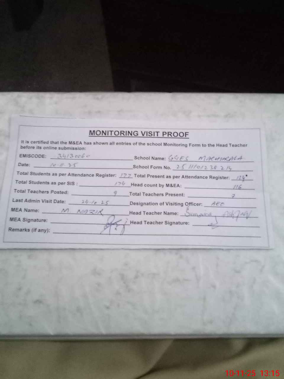 | Attendance Register | Head Teacher | MEA with School | Visit Proof |