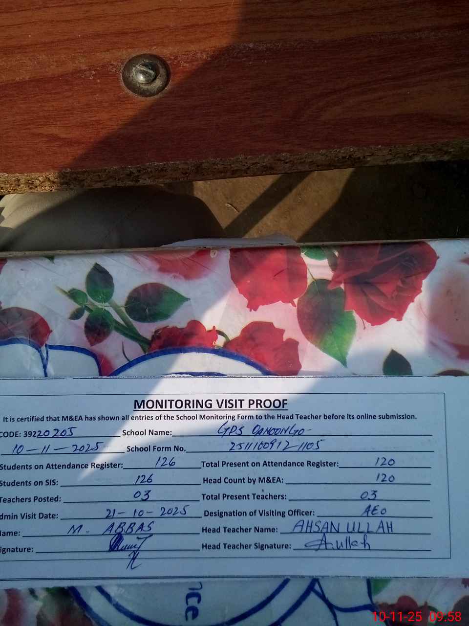 | Attendance Register | Head Teacher | MEA with School | Visit Proof |