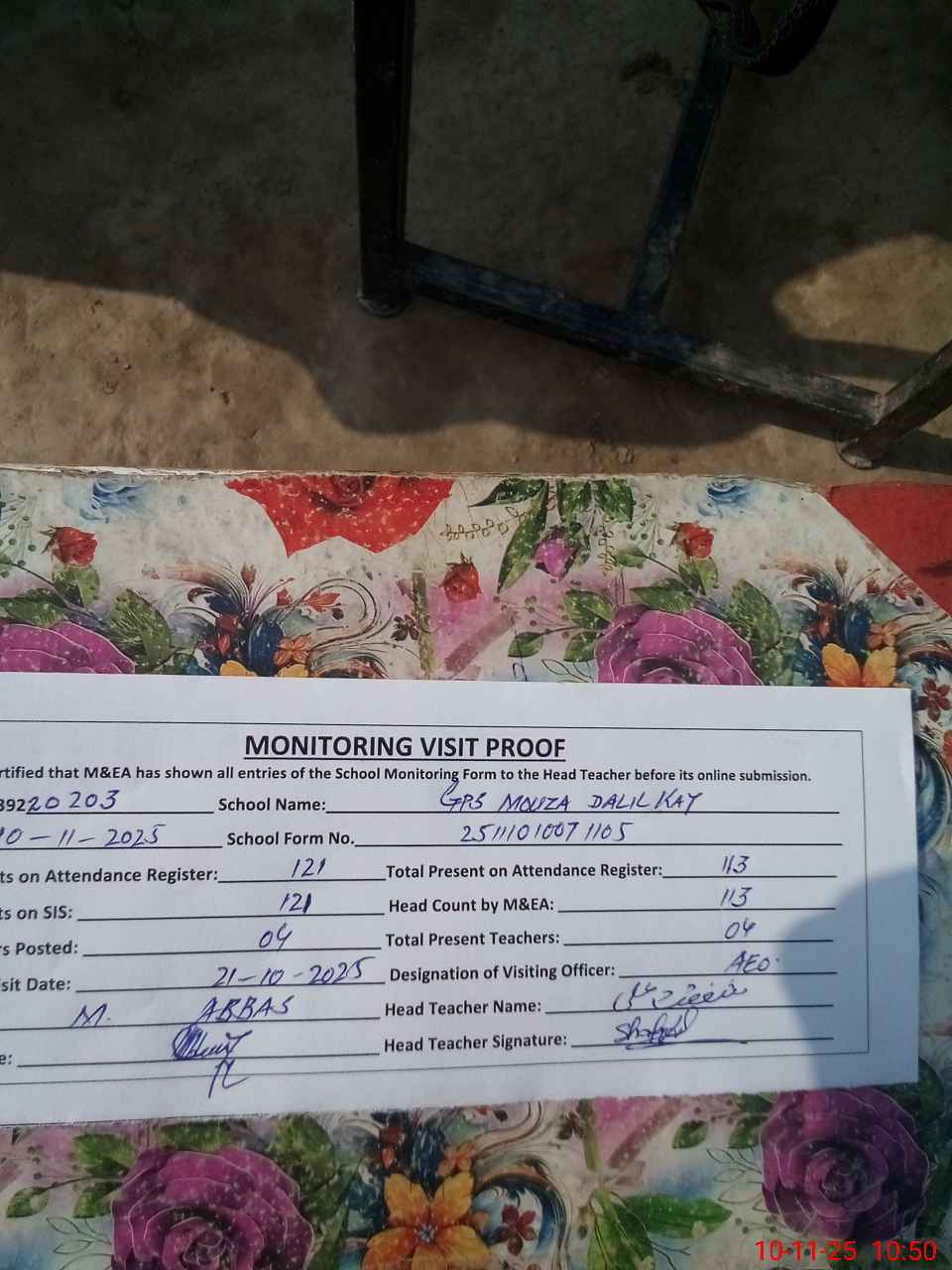 | Attendance Register | Head Teacher | MEA with School | Visit Proof |