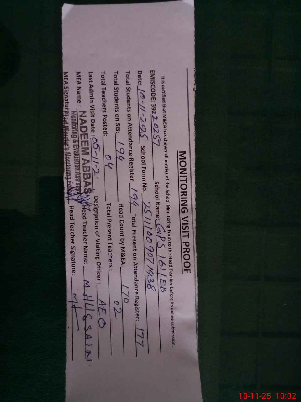 | Certified that this School was Inspected by the Undersigned MEA/DMO Today and the Information Stated Above is as Per Record. | |||||