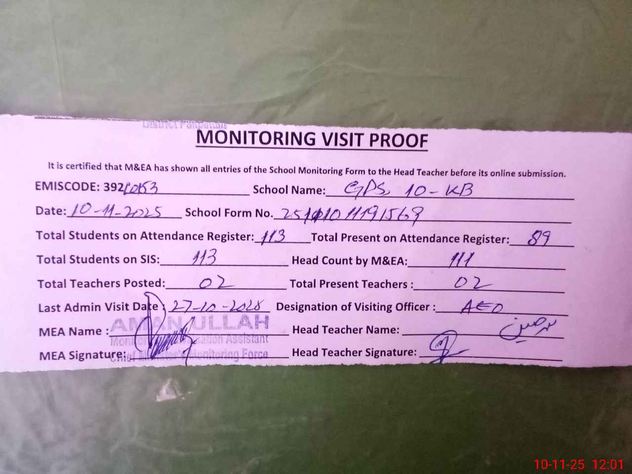 | Monitoring Date: 10-11-2025 | Start Time: 10-11-2025 11:19 AM | End Time: 10-11-2025 12:04 PM | Name of MEA: AM**** UL**** | |