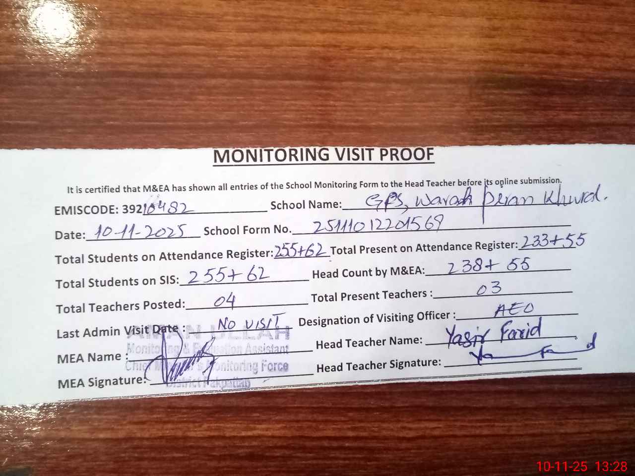 | Attendance Register | Head Teacher | MEA with School | Visit Proof |