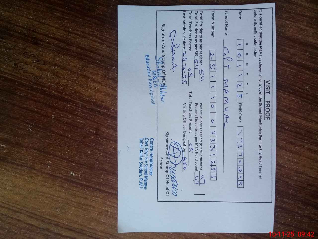 | Attendance Register | Head Teacher | MEA with School | Visit Proof |