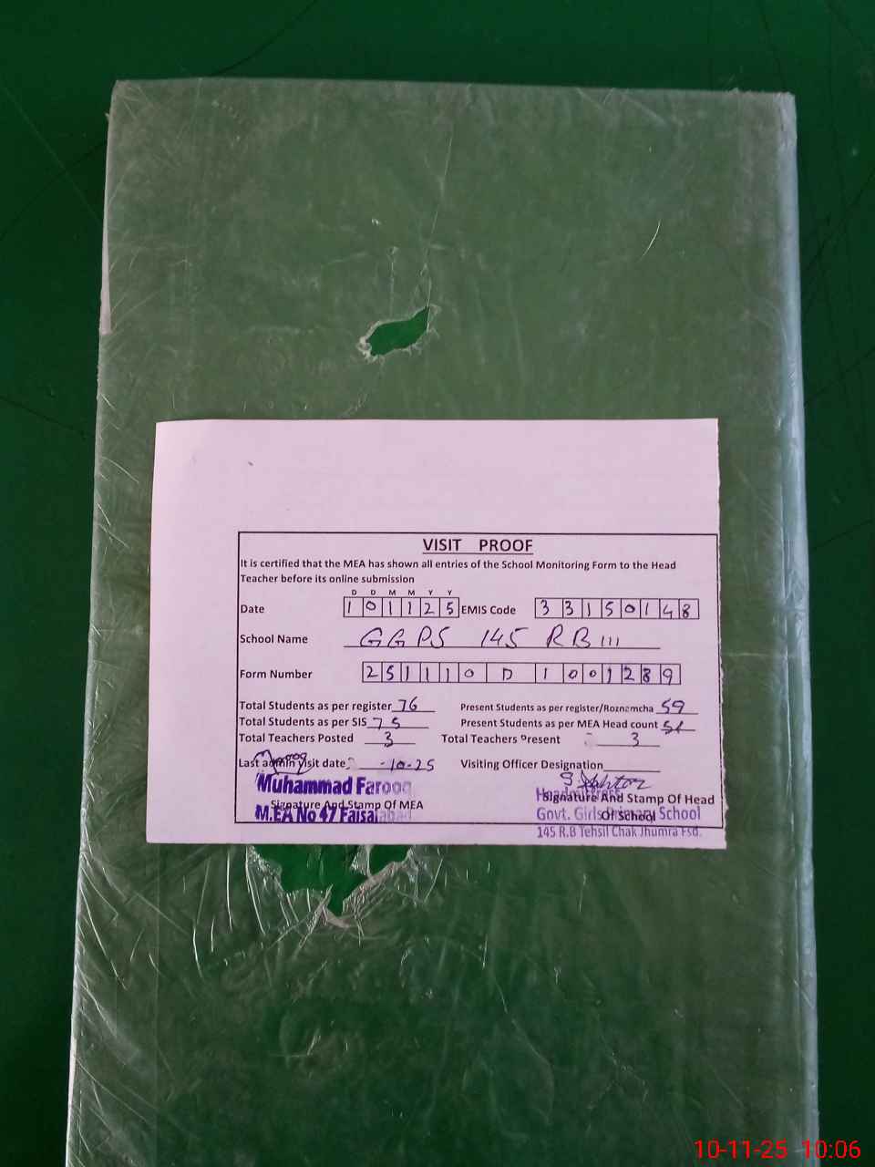 | EMIS Code: 33150148 | Name of School: GGPS CHAK NO 145 RB 111 | |||