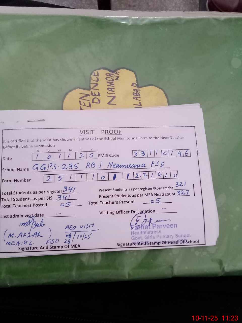 | Attendance Register | Head Teacher | MEA with School | Visit Proof |