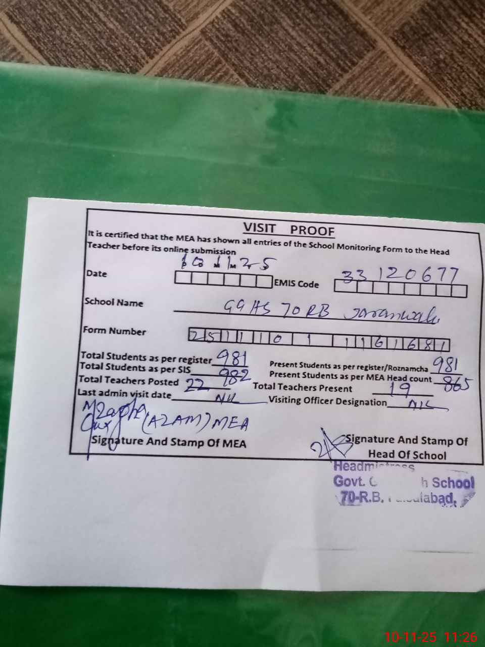 | EMIS Code: 33120677 | Name of School: GGHS CHAK NO 70 RB | |||