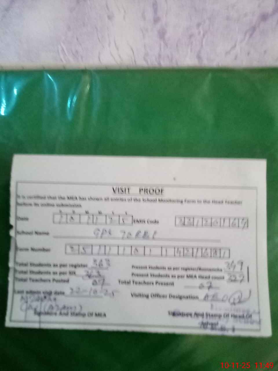 | Attendance Register | Head Teacher | MEA with School | Visit Proof |