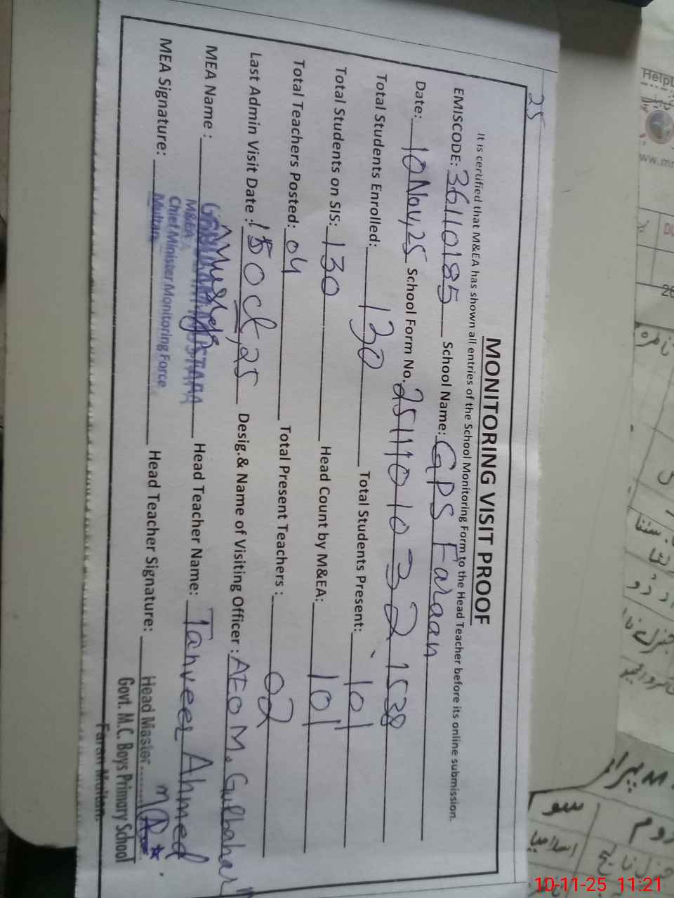 | EMIS Code: 36110185 | Name of School: GPS MC FARAAN NEAR KHONI BURJ MULTAN | |||