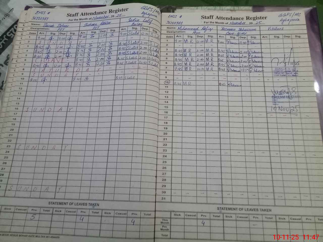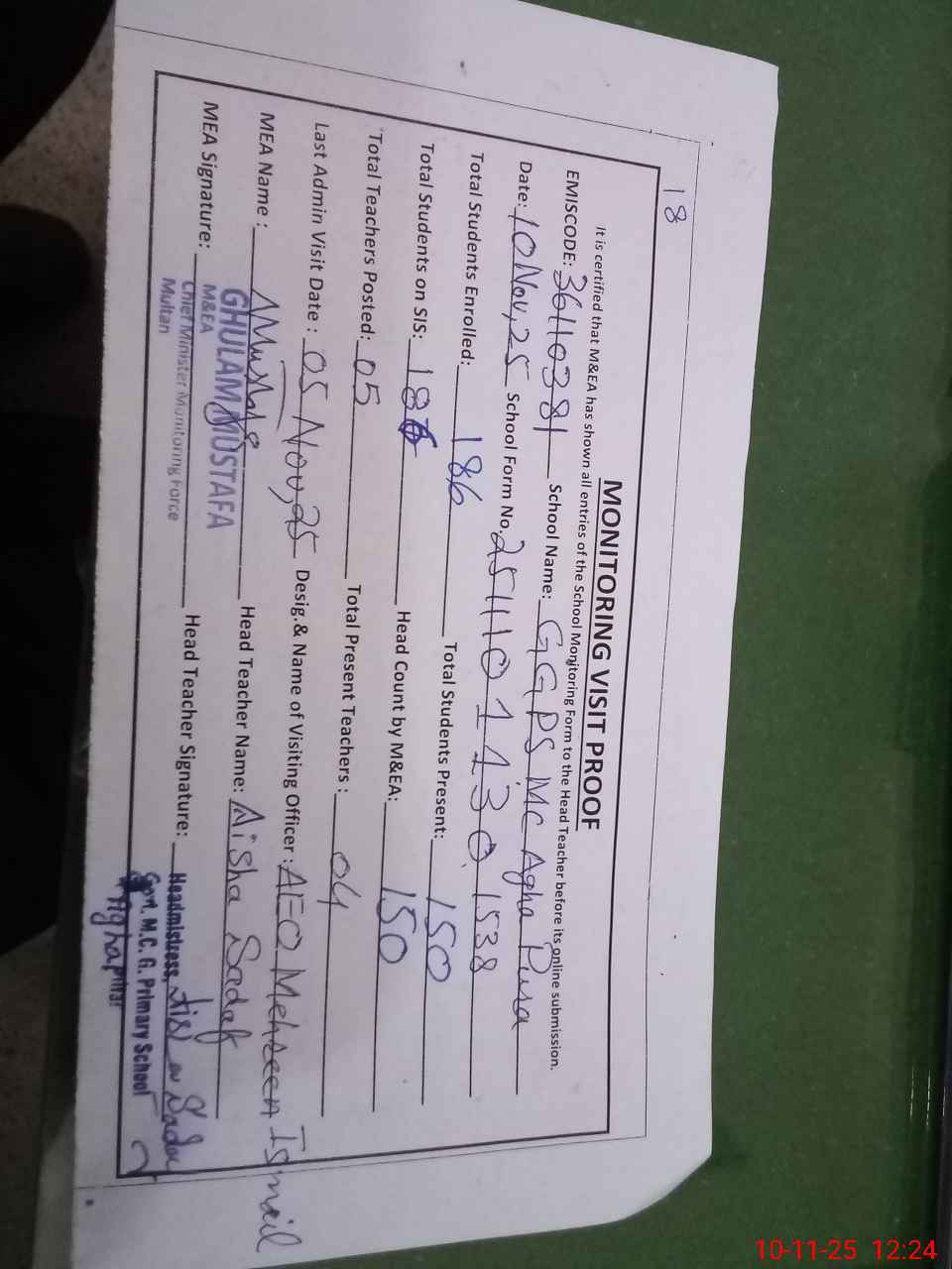 | Remarks (Use Separate Page if Required): SiS tab is not available in the school The enrolled students on sis are 187 however 186 are enrolled As per head teacher difference is due to a 4 class student Husnain which is not being enrolled and does not accept enrollment number | |||||