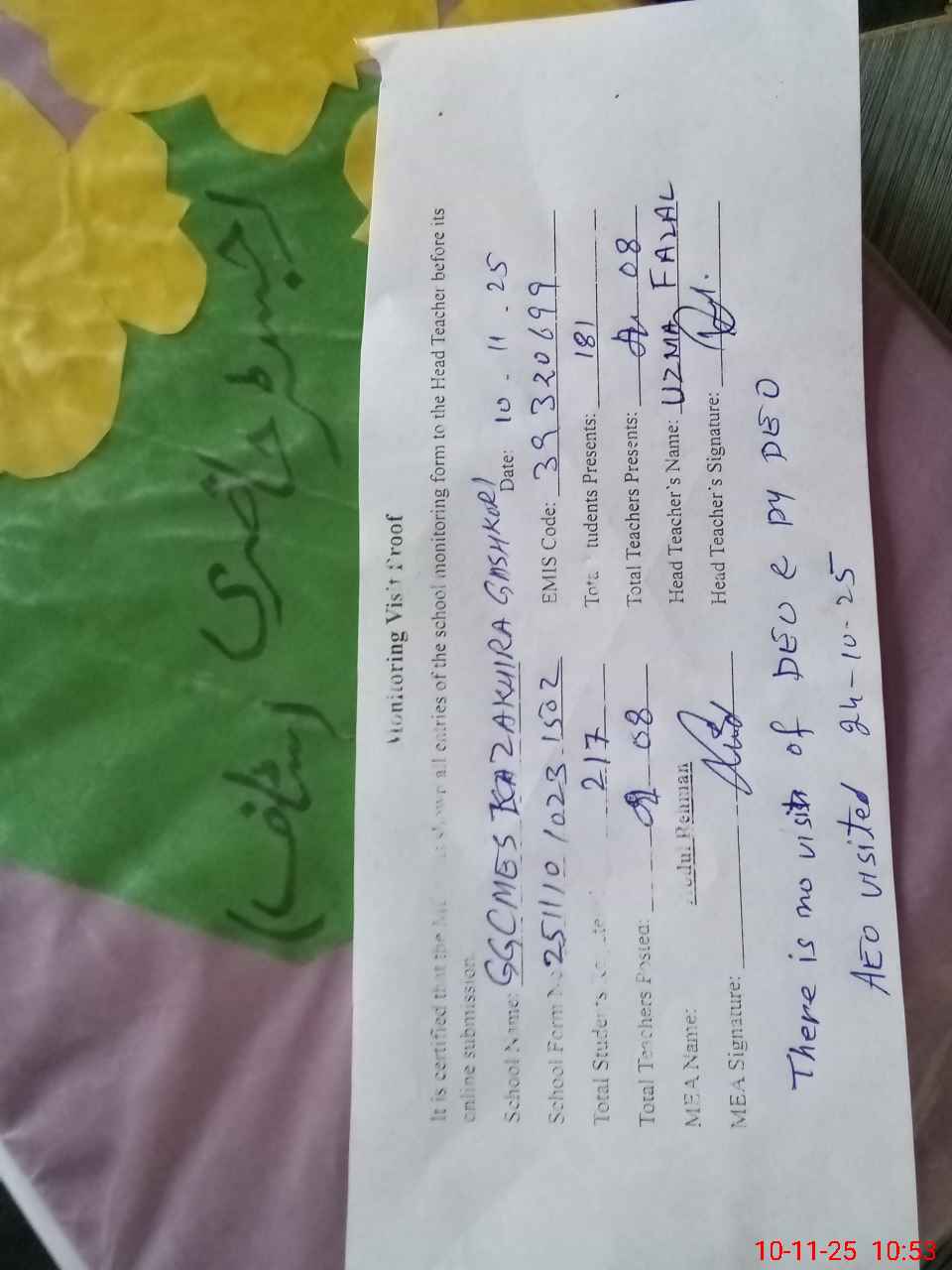 | Remarks (Use Separate Page if Required): There is no visit of DEO and Dy DEO AEO Visited on 24 October 2025 | |||||