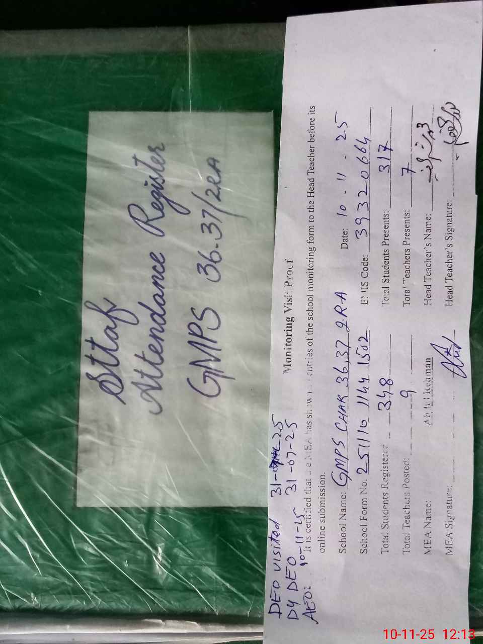 | Remarks (Use Separate Page if Required): DEO and Dy DEO visited on 31 July 2025 AEO Visited on 10 November 2025 | |||||