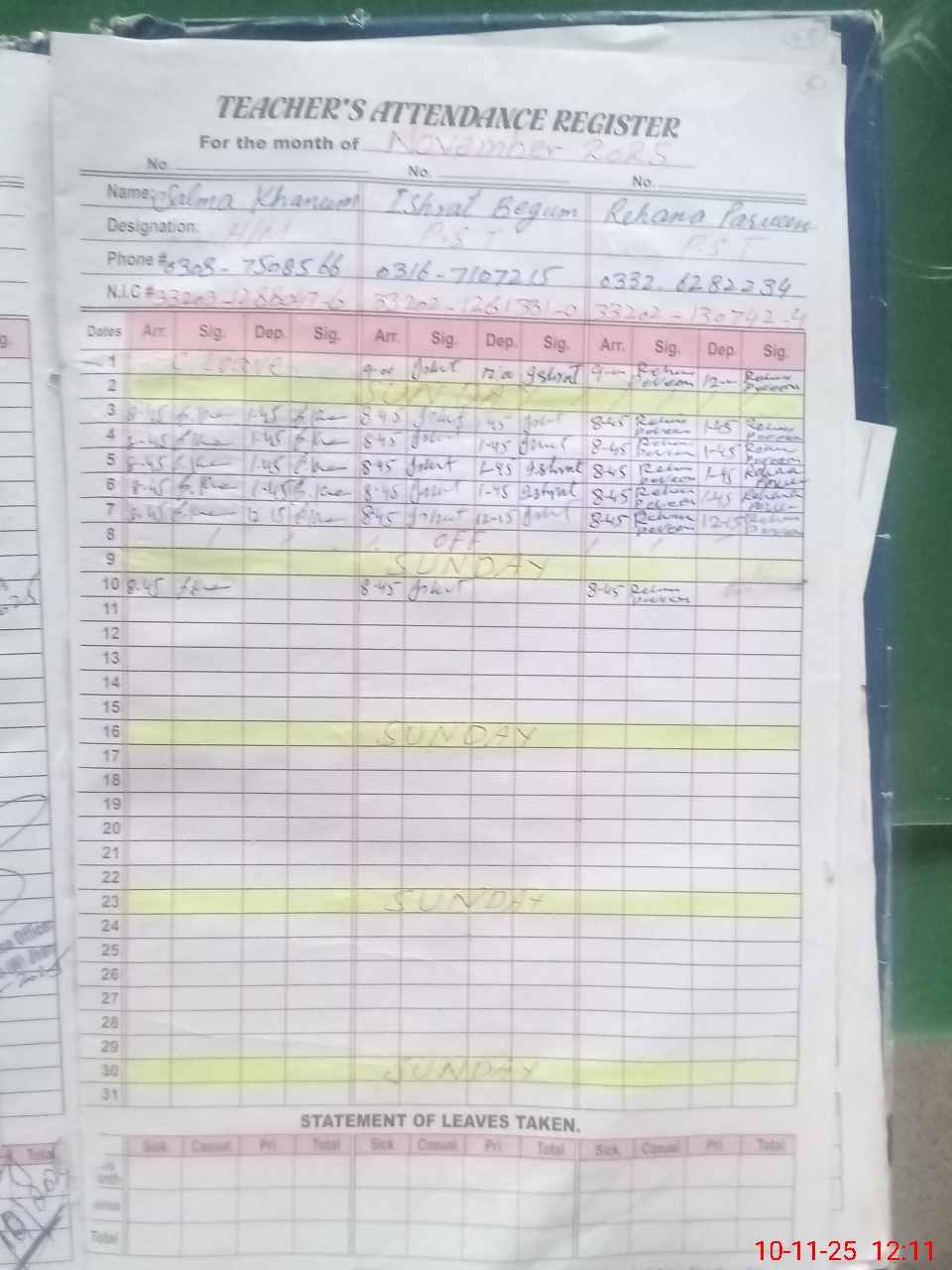 | CNIC | Full Name | Designation | R/C | Absence During Last Calender Month |