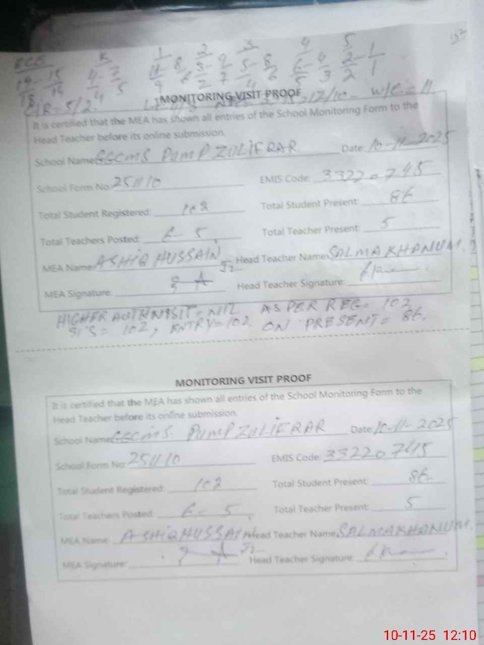 | Attendance Register | Head Teacher | MEA with School | Visit Proof |