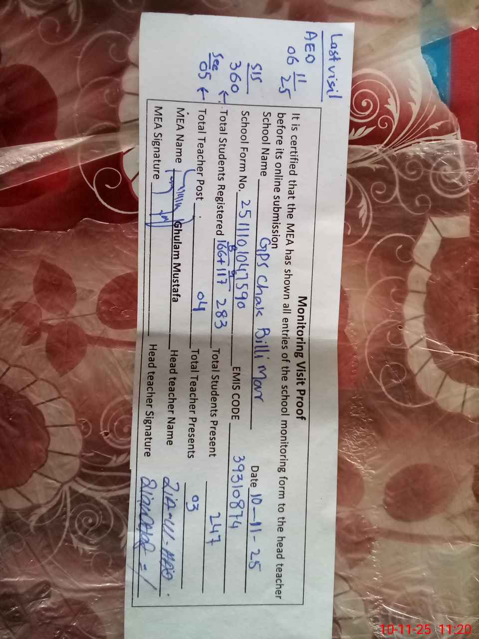 | EMIS Code: 39310874 | Name of School: GPS CHAK BILLI MAR | |||
