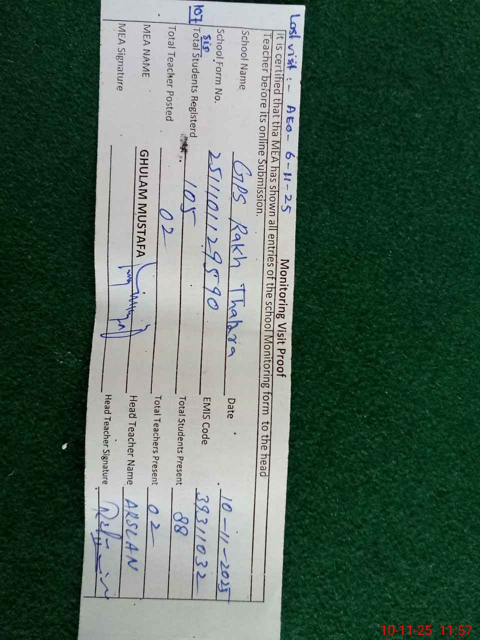 | Attendance Register | Head Teacher | MEA with School | Visit Proof |