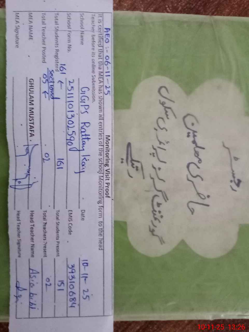 | Attendance Register | Head Teacher | MEA with School | Visit Proof |