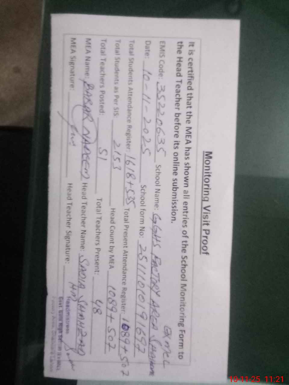 | EMIS Code: 35220635 | Name of School: GGHS FACTORY AREA SHAHDARA (EX-MCL) | |||