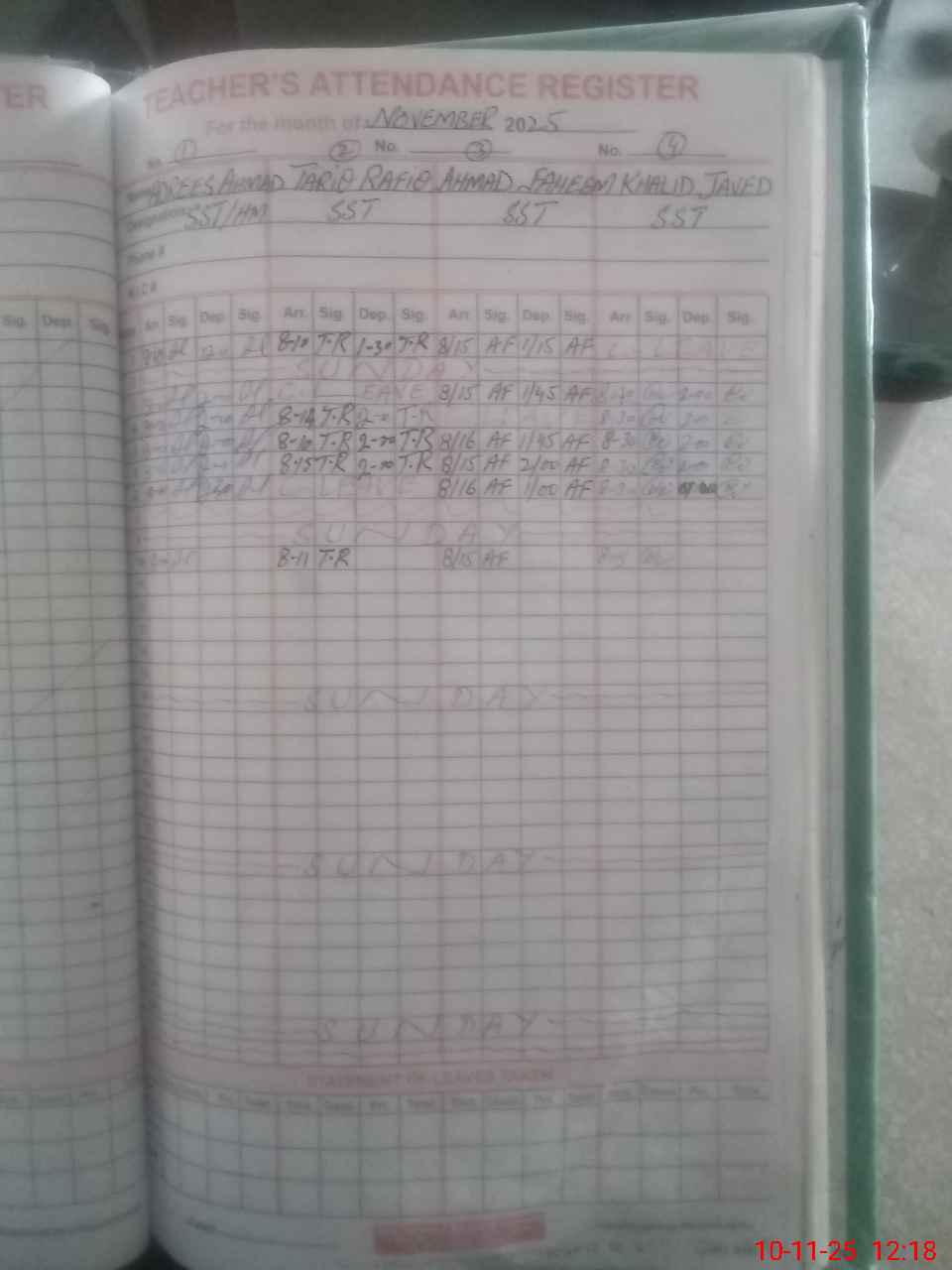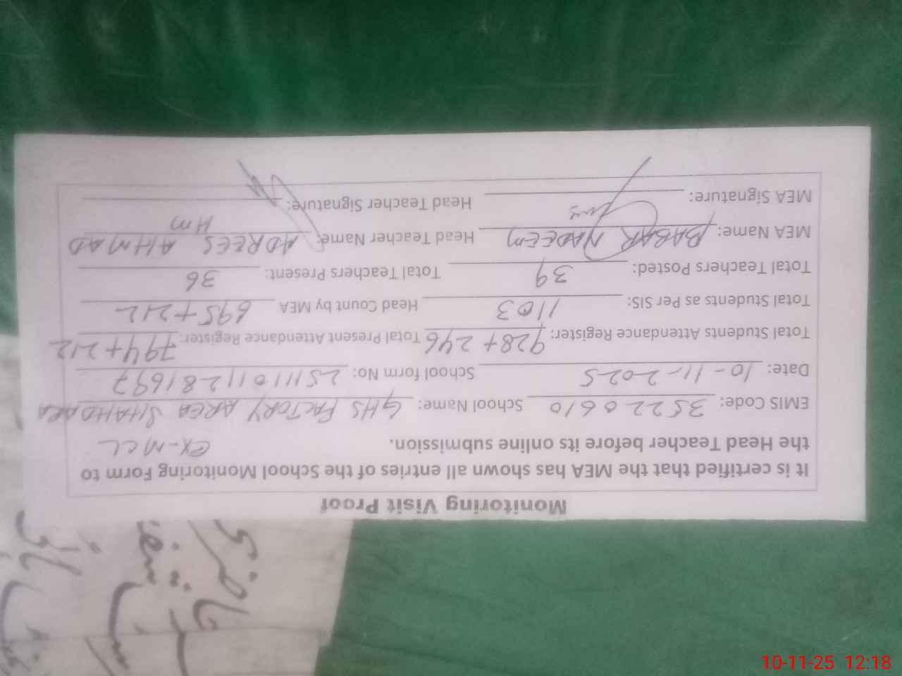 | Remarks (Use Separate Page if Required): 1 Jamshed Masih Sweeper absent from duty since 07 October 2024 to till date 2 A difference of 99 students found while headcounting of the classes | |||||