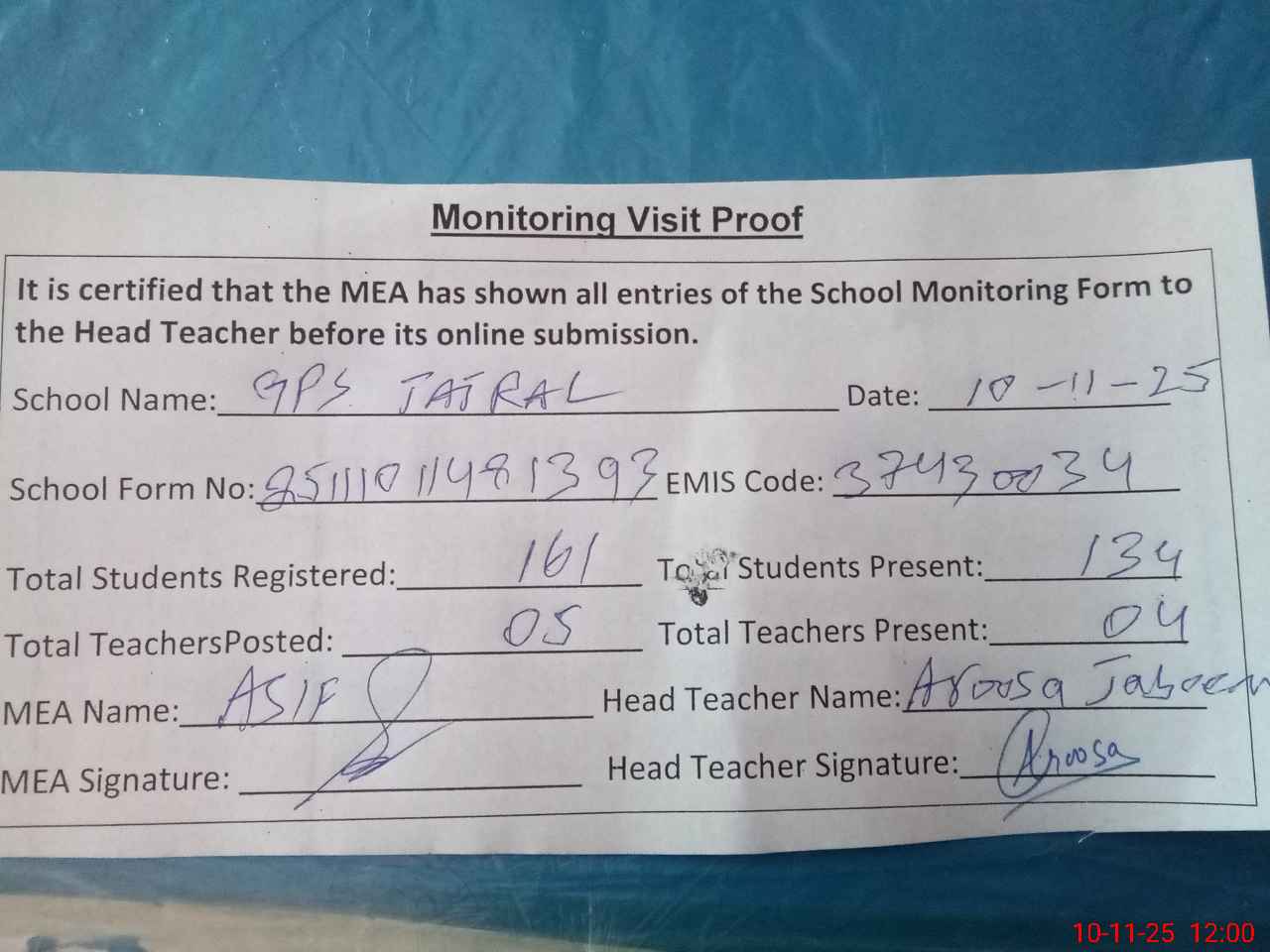 | Attendance Register | Head Teacher | MEA with School | Visit Proof |